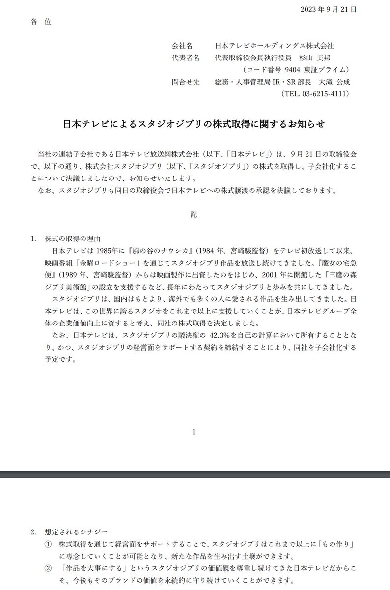 日本テレビホールディングスは21日、連結子会社の日本テレビ放送網がスタジオジブリの株式を取得し、子会社化することを決議したと発表した。日本テレビグループ全体の企業価値向上に資すると判断したという。 pic.twitter.com/bqoOy55EdT