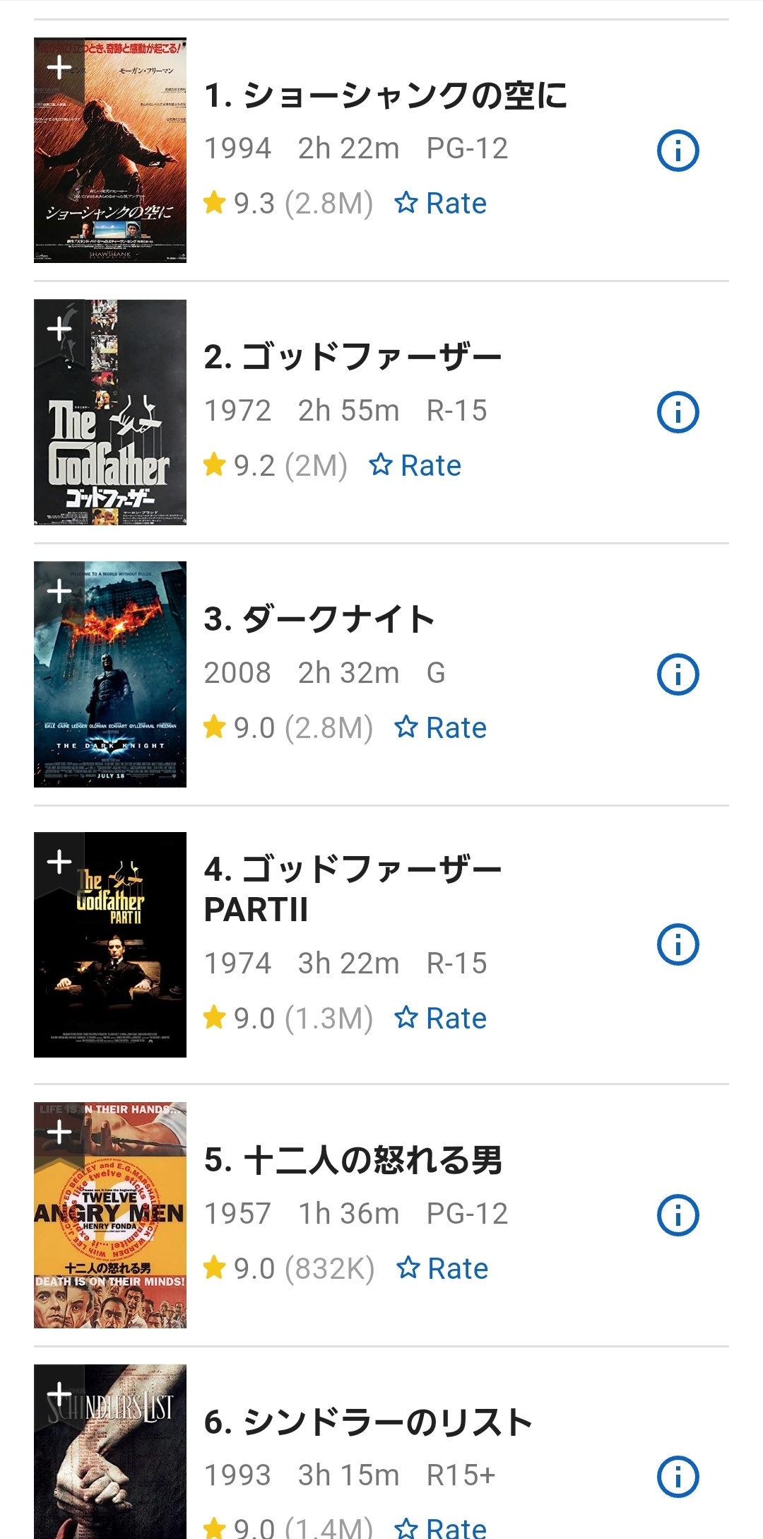 歴代全映画のランキング 2位:ゴッドファーザー 4位:ゴッドファーザーPART2 Twitter Facebook はてブ LINE コピー 2023.09.22 スポンサーリンク 1: それでも動く名無し 2023/09/21(木) 12:57:16.16 ID:LuDyZCywd そんなに面白いんかこの映画? 4: それでも動く名無し 2023/09/21(木) 13:00:41.04 ID:MkNlN+R8d 2の方が評価高いイメージあったけど違うんやな 6: それでも動く名無し 2023/09/21(木) 13:02:24.96 ID:S+jrsc8E0 面白いよ 続きを読む