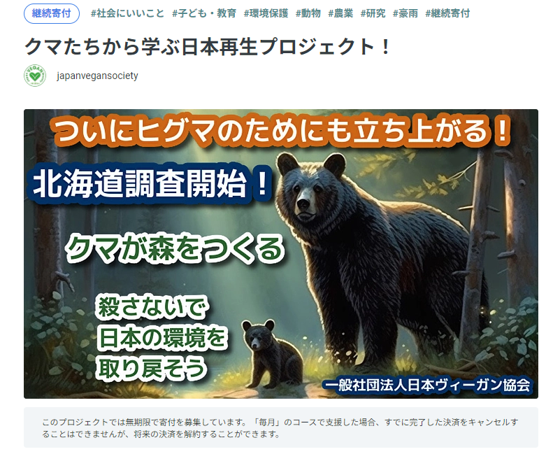 きっかけは、一般社団法人「日本ヴィーガン協会」がヒグマ保護のために立ち上げた「クマたちから学ぶ日本再生プロジェクト!」と題したクラウドファンディング。クラウドファンディングのサイトに掲載されている紹介ページには、内容についてこう説明がされている。