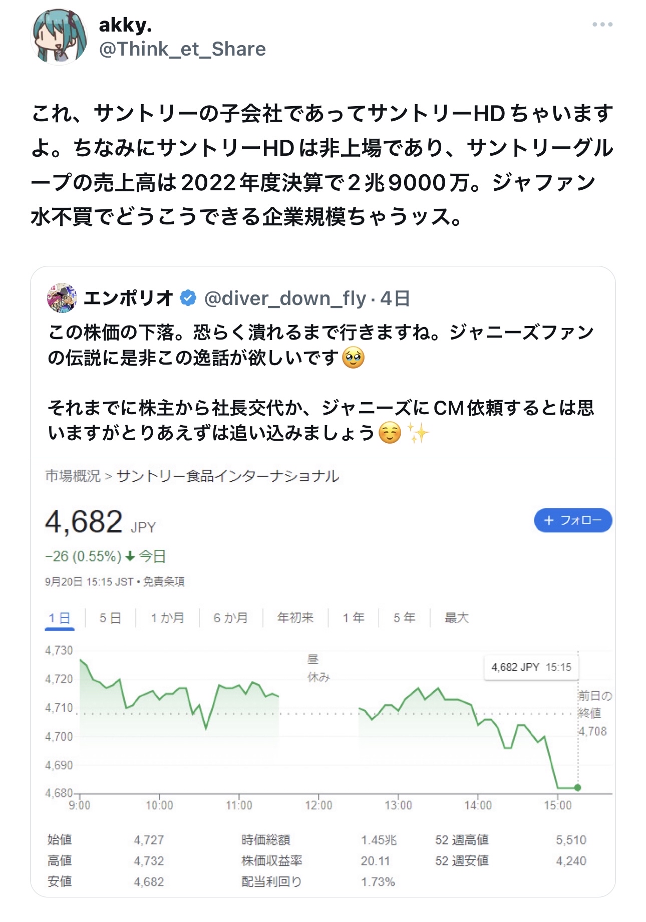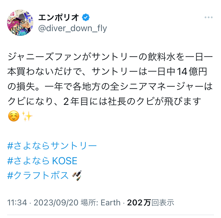 【悲報】ジャニオタ「私達の不買運動でサントリーに1日14億円の損失がでる」 Twitter Facebook はてブ LINE コピー 2023.09.25 スポンサーリンク 1:2023/09/25(月) 01:59:46.74 ID:tdvIUu2h0サントリー社長、ジャニーズに改善なければ「番組スポンサー降板も」:朝日新聞デジタルhttps://www.asahi.com/sp/articles/ASR9H667NR9HULFA03D.html転載元スレッド:https://hayabusa9.5ch.net/test/read.cgi/news/1695574786/ 続きを読む