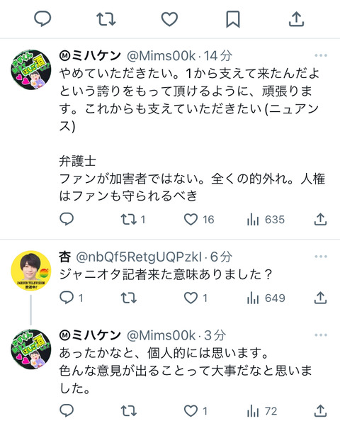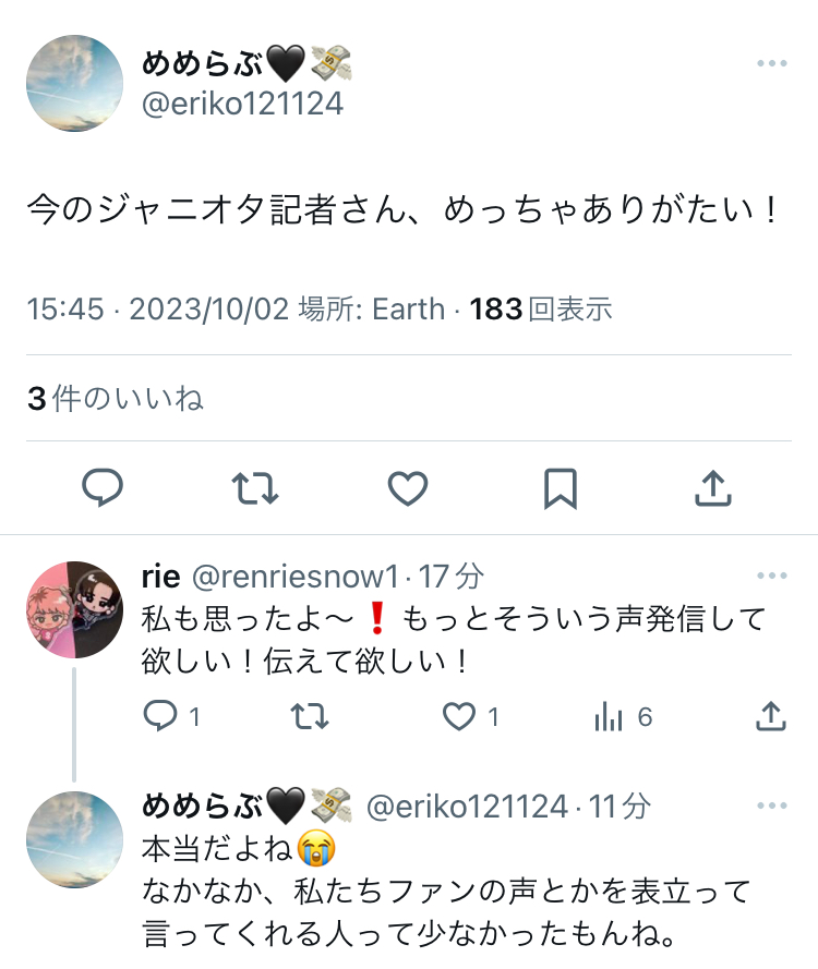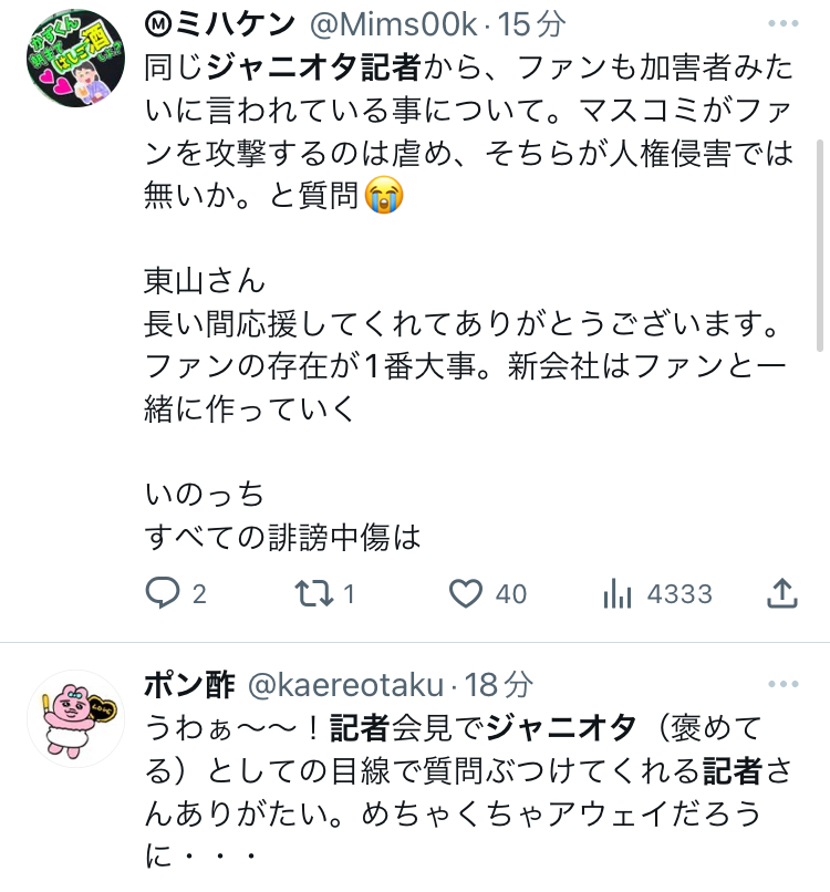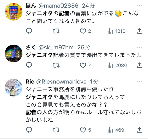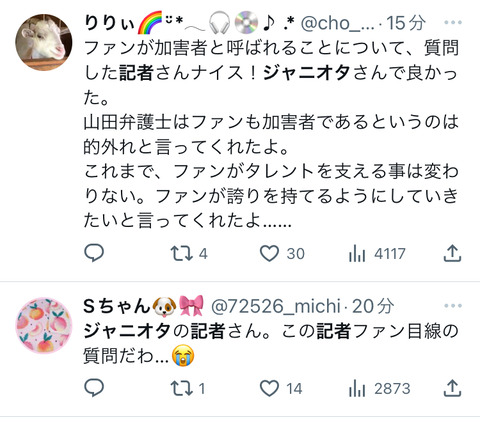 【速報】ジャニーズ会見に現れたジャニオタ記者さん、大絶賛されるwwwwwwwwww Twitter Facebook はてブ LINE コピー 2023.10.02 スポンサーリンク 1:それでも動く名無し:2023/10/02(月) 19:22:19.67 ID:17jMNSQ50 ジャニオタ記者「私は昔からジャニーズが大好きでファンです。今回の問題んでファンも加害者だと言われるのはおかしい!」 続きを読む