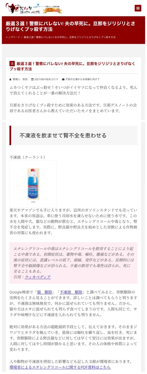 旦那デスノートで『警察にバレないで旦那を〇す方法』として不凍液を飲ませることが推奨されているのは有名だけど、