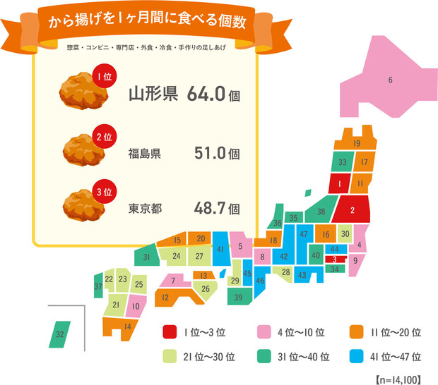 から揚げを1カ月間に食べる平均喫食個数(一人当たり)を推計すると、今年最も多かったのは「山形県」(64.0個)だった。