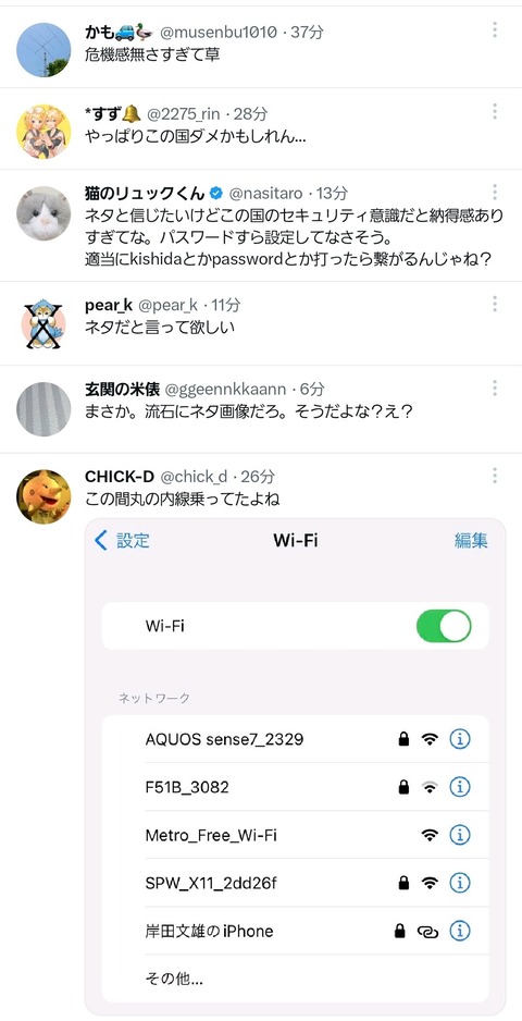 【画像】岸田首相の秘書官、とんでもないwifiを飛ばすwwwwwwwwww Twitter Facebook はてブ LINE コピー 2023.10.10 スポンサーリンク 1:以下、?ちゃんねるからVIPがお送りします:2023/10/10(火) 07:59:53.016 居場所バレバレでワロタ ↓ 2:以下、?ちゃんねるからVIPがお送りします:2023/10/10(火) 08:00:27.255 税金でグリーン車かよ 死ねよ増税クソ眼鏡 3:以下、?ちゃんねるからVIPがお送りします:2023/10/10(火) 08:01:58.299 総理大臣って電車乗るんだ 続きを読む