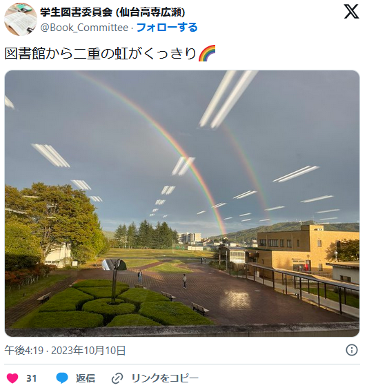 日本全国で二重の虹が出たと、報告が多数ありトレンド入り Twitter Facebook はてブ LINE コピー 2023.10.10 スポンサーリンク 図書館から二重の虹がくっきり🌈 pic.twitter.com/9hKJ7nqFhr— 学生図書委員会 (仙台高専広瀬) (@Book_Committee) 2023年10月10日 ぶっちゃけ少子化ってどうやったら解消されるんだろうな 続きを読む