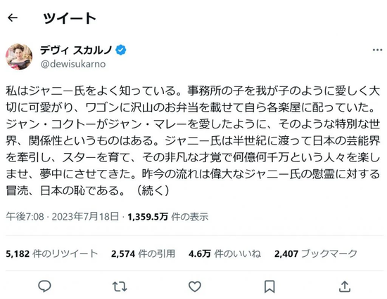 過日 私はジャニー喜多川氏について庇護する発言をXに表明致しましたが、様々な報道で私の全く知らない喜多川氏の愚行を知り、驚きと共におぞましく感じました。以前の発言を撤回させていただくと共に、私の発言により傷ついた方、怒りを覚えた方に心より申し訳なく思います。