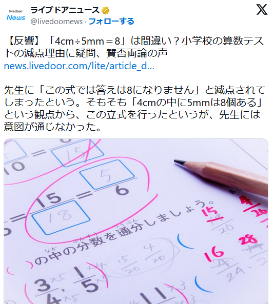 【反響】「4cm÷5mm=8」は間違い?小学校の算数テストの減点理由に疑問、賛否両論の声https://t.co/gCbOQot5a8