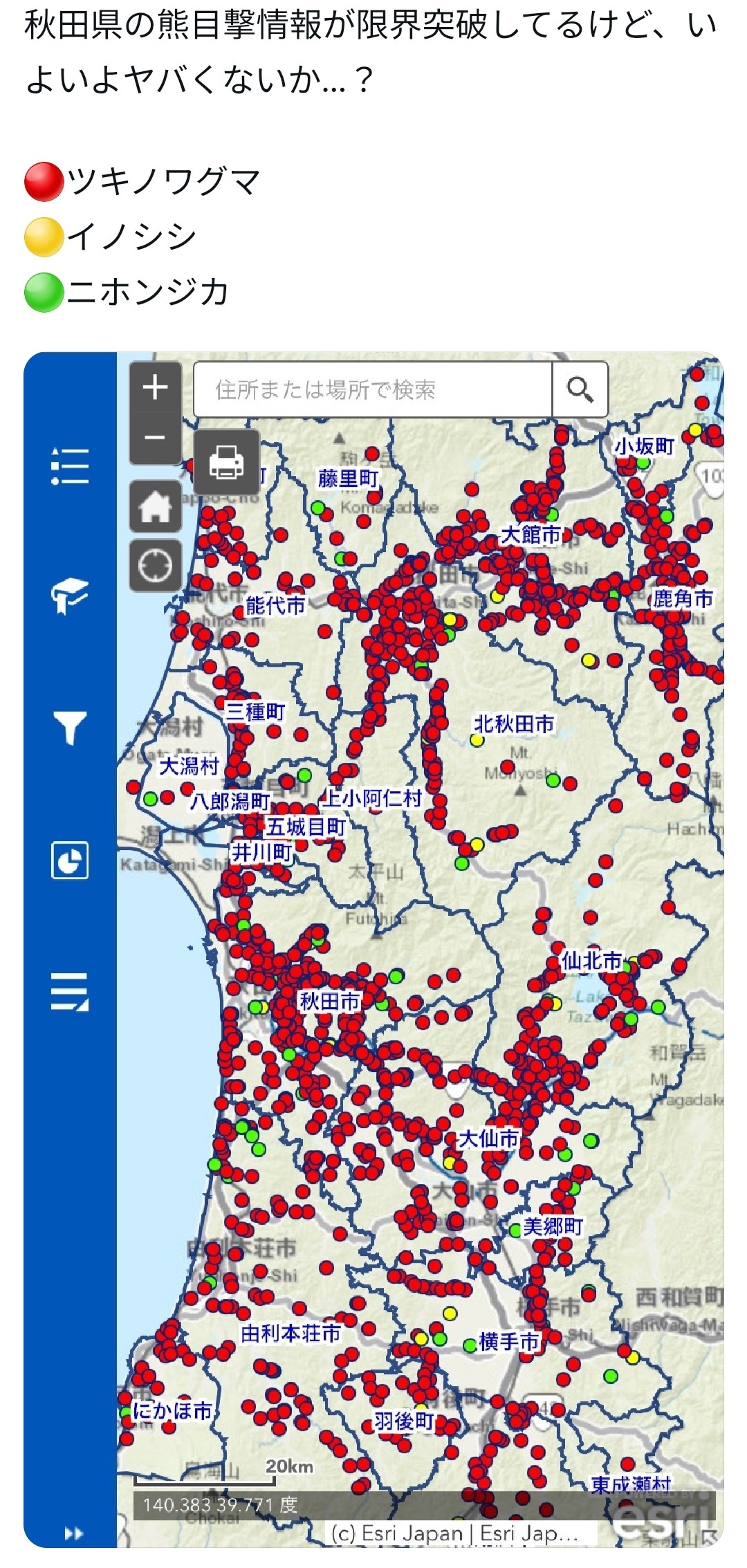 秋田県の熊目撃情報が限界突破してるけど、いよいよヤバくないか…?