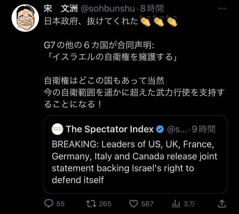 岸田首相、英断。「イスラエルの自衛権行使を支持するG7共同声明」に唯一賛同せず Twitter Facebook はてブ LINE コピー 2023.10.23 スポンサーリンク 1: うんち(茸) [ニダ] 2023/10/23(月) 18:02:25.65 ID:tYzKXbuA0 BE:271912485-2BP(1500) ソース やるやん岸田 休養中のフジ・渡邊渚アナ「いろんなものを失いました」「仕事も目標もなくなった」「生きることを投げ出したいとも」 続きを読む