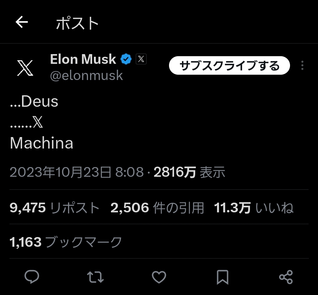【画像】イーロン・マスク、かっこいいポストを投稿 Twitter Facebook はてブ LINE コピー 2023.10.25 スポンサーリンク 1:2023/10/25(水) 14:16:05…Deus……𝕏Machina— Elon Musk (@elonmusk) October 22, 2023 デウス・エクス・マキナ - Wikipedia2:2023/10/25(水) 14:16:37中学生3:2023/10/25(水) 14:16:54ドヤ顔感4:2023/10/25(水) 14:17:34暇なの?転載元スレッド:https://viper.2ch.sc/test/read.cgi/news4vip/1698210965/ 続きを読む