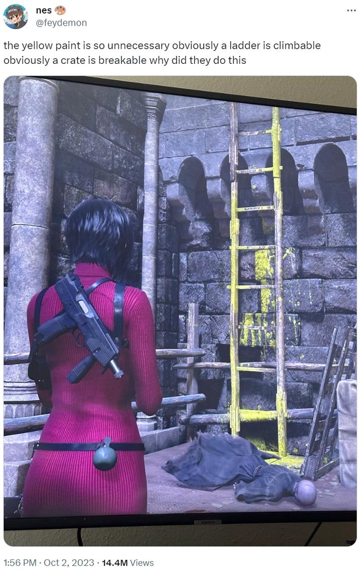 『バイオハザード RE:4』では、プレイヤーがインタラクトできる一部オブジェクトが分かりやすいように黄色いペイントが施されている。この点についてわかりやすいというユーザーと雰囲気にそぐわないといった不満を述べるユーザーに割れ、議論を巻き起こしているようだ。この議論は本作の登場以来続けられてきた様子で、ネットミームとして認識されるほどの広がりを見せている。