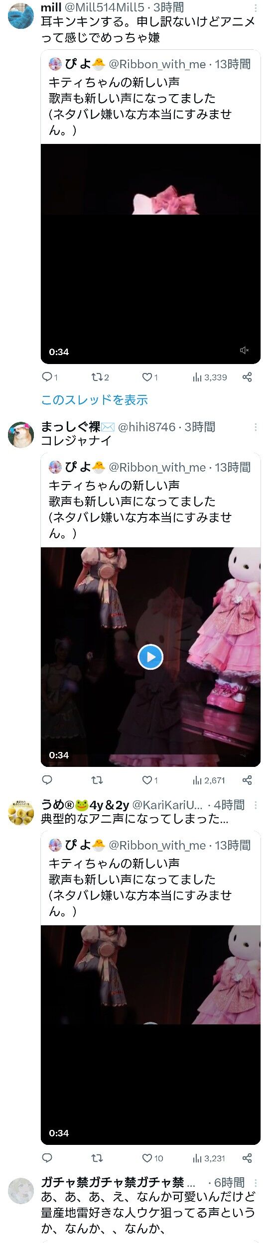 【悲報】キティちゃんの新声優、めちゃくちゃ叩かれまくる Twitter Facebook はてブ LINE コピー 2023.11.02 スポンサーリンク 1: それでも動く名無し 2023/11/02(木) 07:16:12.94 ID:yqNa0Xlir もうアカンやん 【闇深】声優の林原めぐみがキティ役卒業、声優交代のニュース、続々削除される、ハローキティの中の人など居ない為? 続きを読む