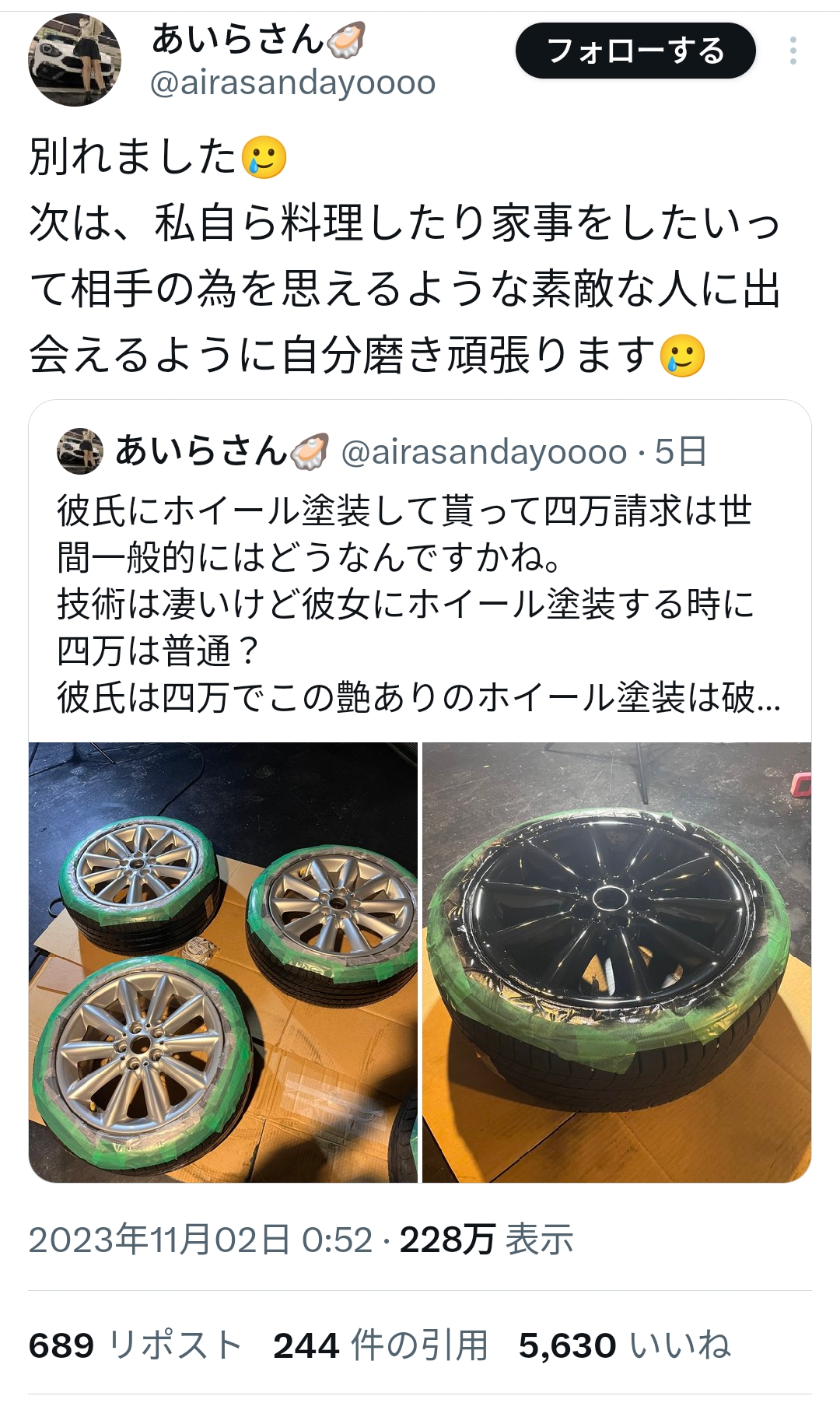 技術は凄いけど彼女にホイール塗装する時に四万は普通?