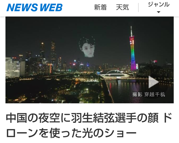 中国南部の広州で行われたドローンを使った光のショーに、北京オリンピックで活躍する中国の選手とともに外国人選手で唯一、フィギュアスケートの羽生結弦選手の顔が登場し、話題になっています