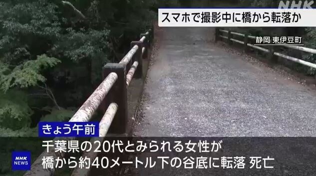 4日午前、静岡県東伊豆町で、千葉県の20代とみられる女性が橋からおよそ40メートル下の谷底に転落して死亡し、警察はスマートフォンで景色を撮影中に誤って転落したとみて調べています。