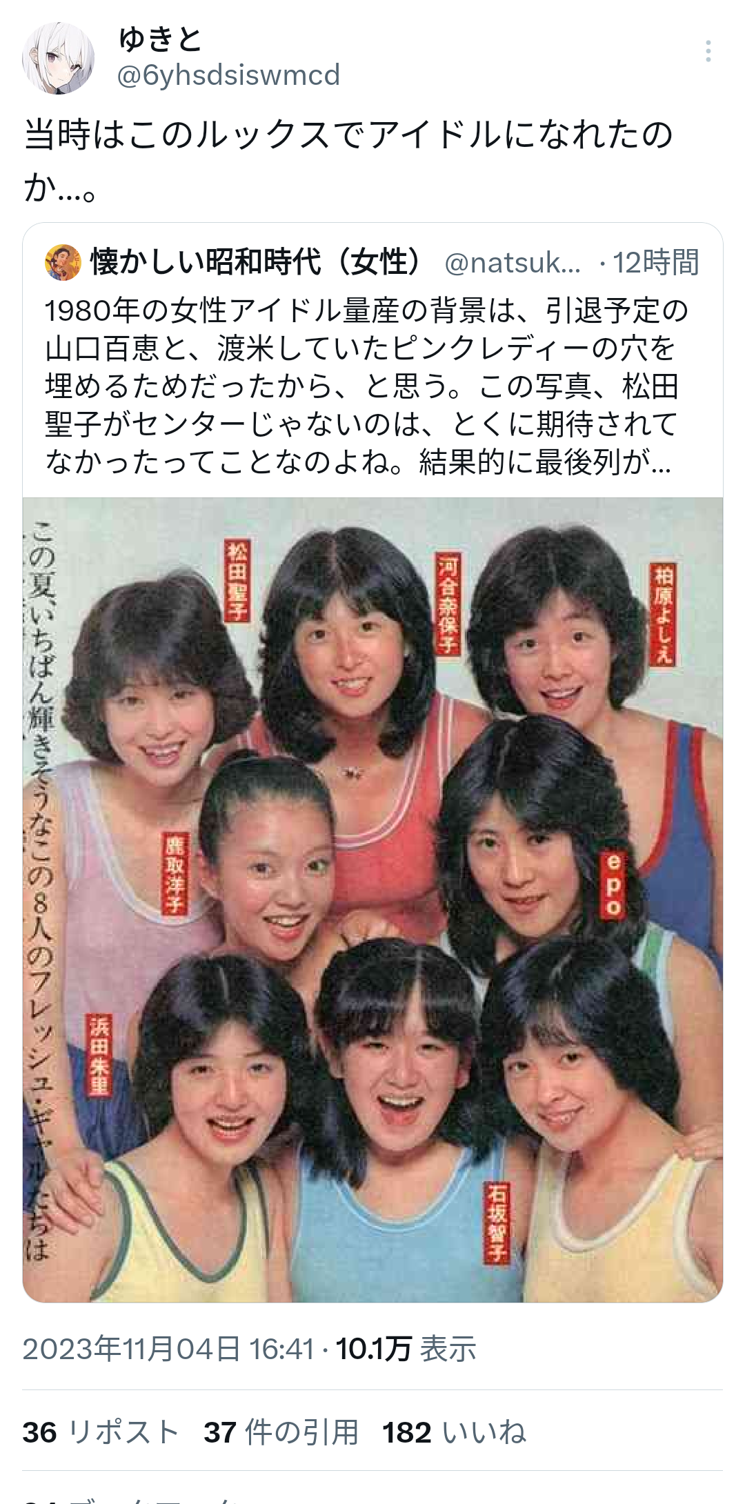 【悲報】X(旧ツイッター)民「1980年代ってこのレベルの顔でもアイドルになれたんだな」→おっさんブチギレ Twitter Facebook はてブ LINE コピー 2023.11.04 スポンサーリンク 1: それでも動く名無し 2023/11/04(土) 21:47:54.52 ID:tyjTBGmo0 ↓ 【速報】欧米、ウクライナに停戦促す動き 米NBC報道 続きを読む