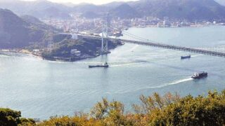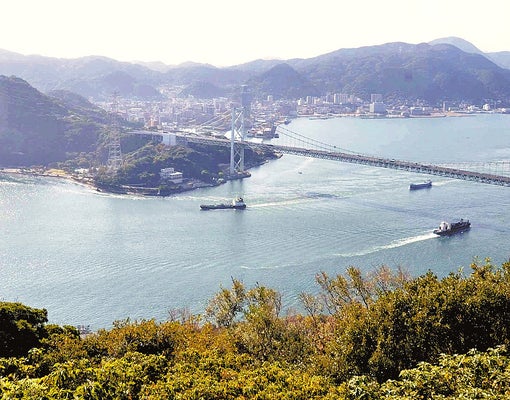 山口県下関市側から望む関門海峡。対岸の北九州市に向かって滑降する計画だ