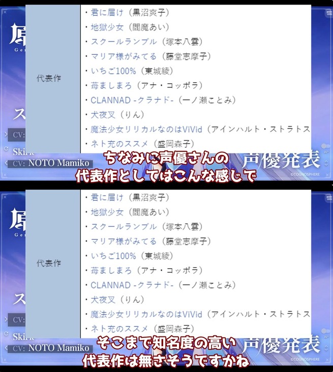 この原神の解説チャンネル、能登麻美子さんの作品無名とか言っててバチバチにエアプ晒しててコメ欄大荒れしてて笑う pic.twitter.com/eBGehSr30e