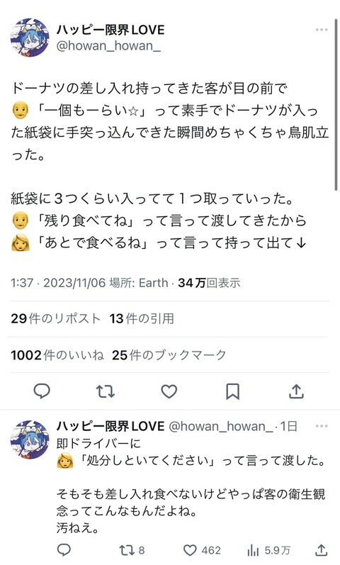 男性器さわった手でつかんだかもしれないドーナツとか無理