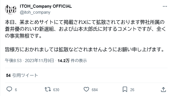 事務所は、これをフェイクニュースと断じ、「このような掲載に対して弊社と致しましても毅然とした対応をしていく所存です」と表明。Xでは「皆様方におかれましては拡散などされませんようにお願い申し上げます」と呼びかけている。