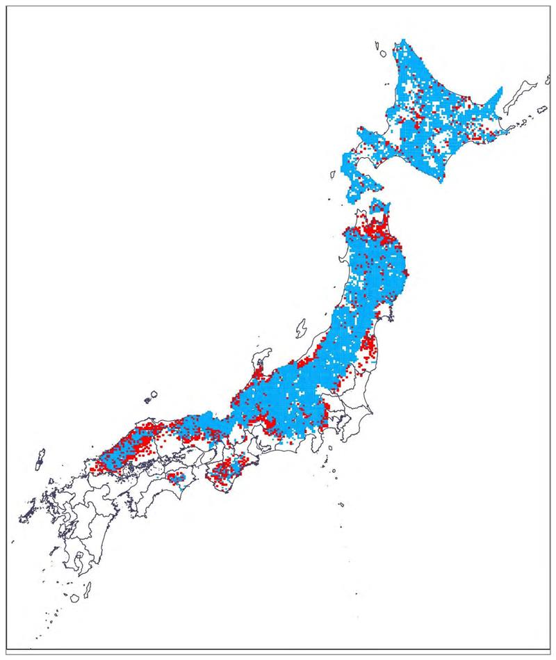 水色が2004年の環境省によるクマの確認地点、赤色はその後の分布拡大エリア(14年3月の日本クマネットワークの報告書より)