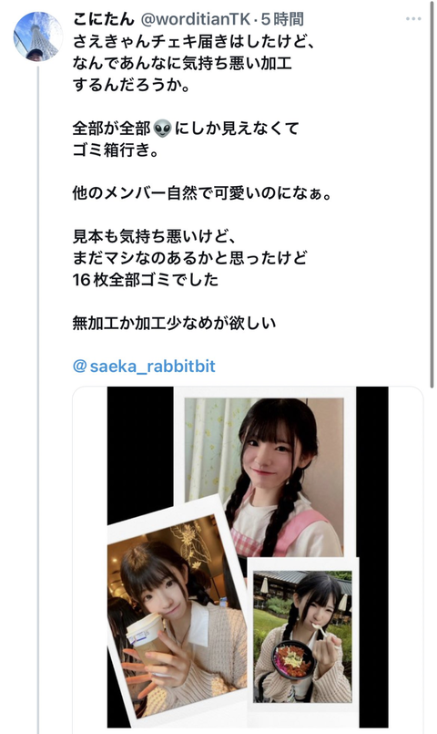 【朗報】鋼メンタルのアイドル、発見されるwwww (※画像あり) Twitter Facebook はてブ LINE コピー 2023.11.16 スポンサーリンク 1:それでも動く名無し:2023/11/15(水) 11:02:23.40 ID:Cwi1JI9c0.net 「アイドルの写真を買ったが宇宙人にしか見えなかったから全部ゴミ箱行きに」というツイートをオタクが投稿 ↓ それを知った本人がのイラストと共に自撮りツイート 続きを読む