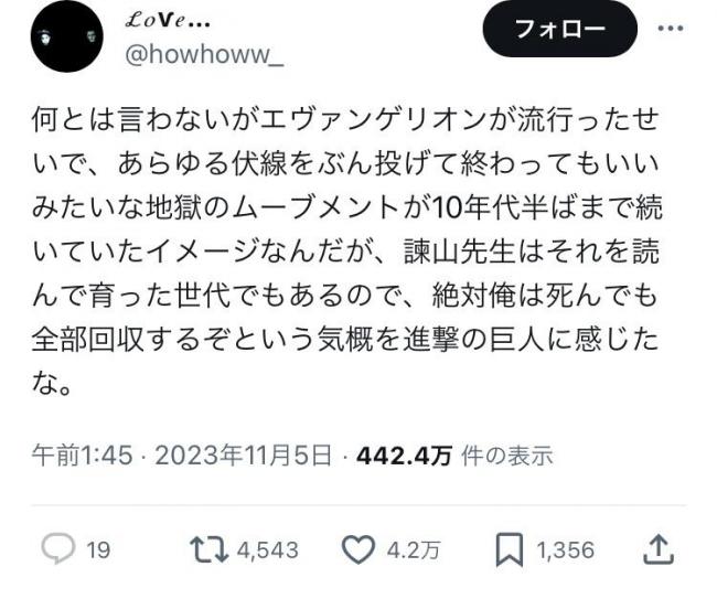 有識者「エヴァのせいで伏線ぶん投げて終わるブームが20年間続いたが、進撃がそれを終わらせてくれた」 Twitter Facebook はてブ LINE コピー 2023.11.16 スポンサーリンク 1: それでも動く名無し 2023/11/15(水) 16:54:44.84 ID:PaETI7XaM https://twitter.com/howhoww_/status/1720844754420899943 3: それでも動く名無し 2023/11/15(水) 16:56:26.06 ID:hLTYWGDA0 回収したけど中の人達自身がよう解んなくなってしまったな 4: それでも動く名無し 2023/11/15(水) 16:56:27.60 ID:MyYdowSXp そんなブーム10年も続かなかったよな 最近の作品知らないだけや 続きを読む