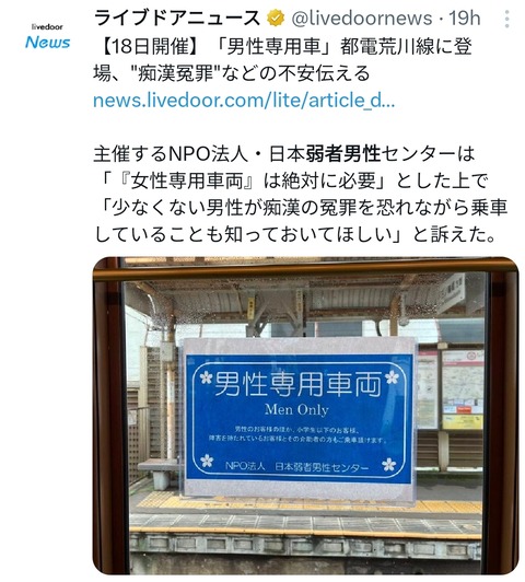 【悲報】男性専用車両、爆誕WIWIWIWIWIWIWIWIWIWIWIWIWIWIWIWIWIWIWIWIWIWIWIWIWIWIWIWIWIWIW Twitter Facebook はてブ LINE コピー 2023.11.16 スポンサーリンク 1:それでも動く名無し:2023/11/16(木) 12:46:34.08 ID:D2Bfmjgfr.net https://news.livedoor.com/lite/article_detail/25356237/ 5:それでも動く名無し:2023/11/16(木) 12:48:36.52 ID:9k+hHJdQ0.net 弱者男性センターってなんだよ 続きを読む