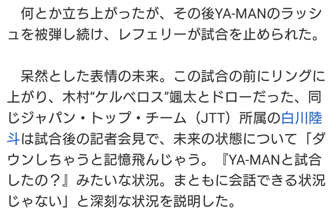 朝倉未来、KO負けで記憶が飛ぶ「僕、YA-MANと試合してたの?」 Twitter Facebook はてブ LINE コピー 2023.11.20 スポンサーリンク 1: それでも動く名無し 2023/11/19(日) 22:05:26.08 ID:DqqRwiSAM https://news.yahoo.co.jp/articles/272cb744089d2aad772d5467c5c7dcca5928798c 9: それでも動く名無し 2023/11/19(日) 22:07:09.70 ID:IiNRhM/K0 もう辞めろ 脳にダメージ残るぞ 12: それでも動く名無し 2023/11/19(日) 22:07:32.25 ID:bZmuCTOO0 キレイな目をしている 続きを読む