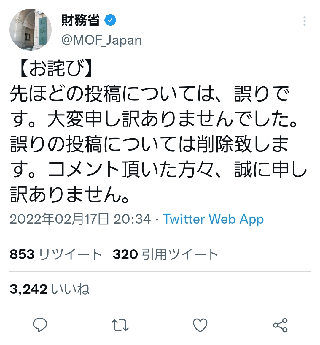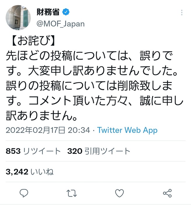 【悲報】財務省公式Twitterが謝罪「先ほどの投稿については、誤りです」