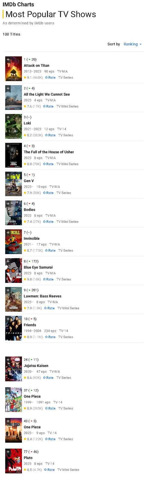 1位:進撃の巨人 24位:呪術廻戦 37位:ワンピース 43位:実写版ワンピース 77位PLUTO