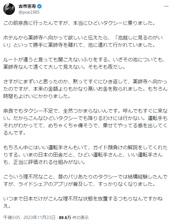 さらに「さすがにまずいと思ったのか、黙ってすぐにひき返して、薬師寺へ向かったのですが、本来の金額よりもかなり高いお金を取られました。もちろん時間もよけいにかかりました」と嘆いた上で「奈良でもタクシー不足で、全然つかまらないんです。呼んでもすぐに来ない。だからこんなひどいタクシーでも降りるわけには行かない。運転手もそれがわかってて、めちゃくちゃ偉そうで、乗せてやってる感を出してくるんです」とタクシー不足が生んだ弊害の例だと指摘した。