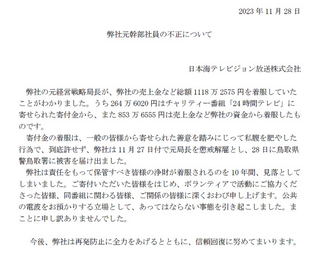 日本海テレビを11月27日付けで懲戒解雇となったのは、元経営戦略局の局長。元局長は会社の調べに対し、「24時間テレビ」の寄付金から計264万6020円を着服していた。このほか、会社の売上金853万6555円も自らのフトコロに入れていた。