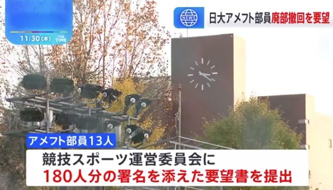アメフト部の部員は大学本部を訪れたあと、180人分の署名を添えた要望書を大学の競技スポーツ運営委員会に提出したということです。