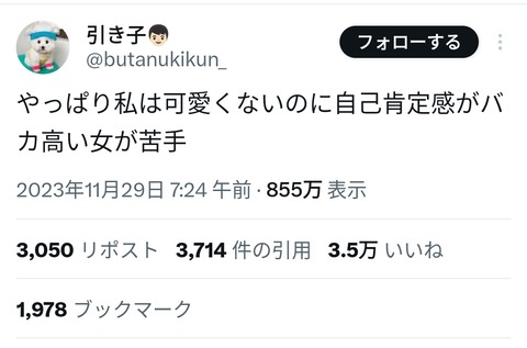【悲報】女さん「可愛くないのに自己肯定感高い女嫌い」7万いいねwwwwwwwwww