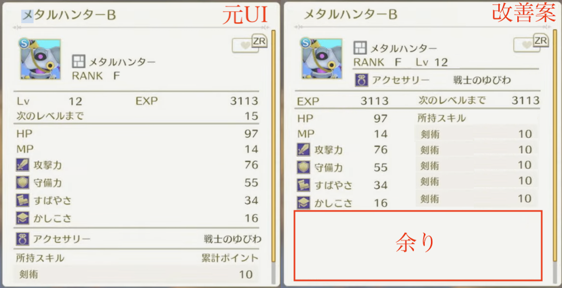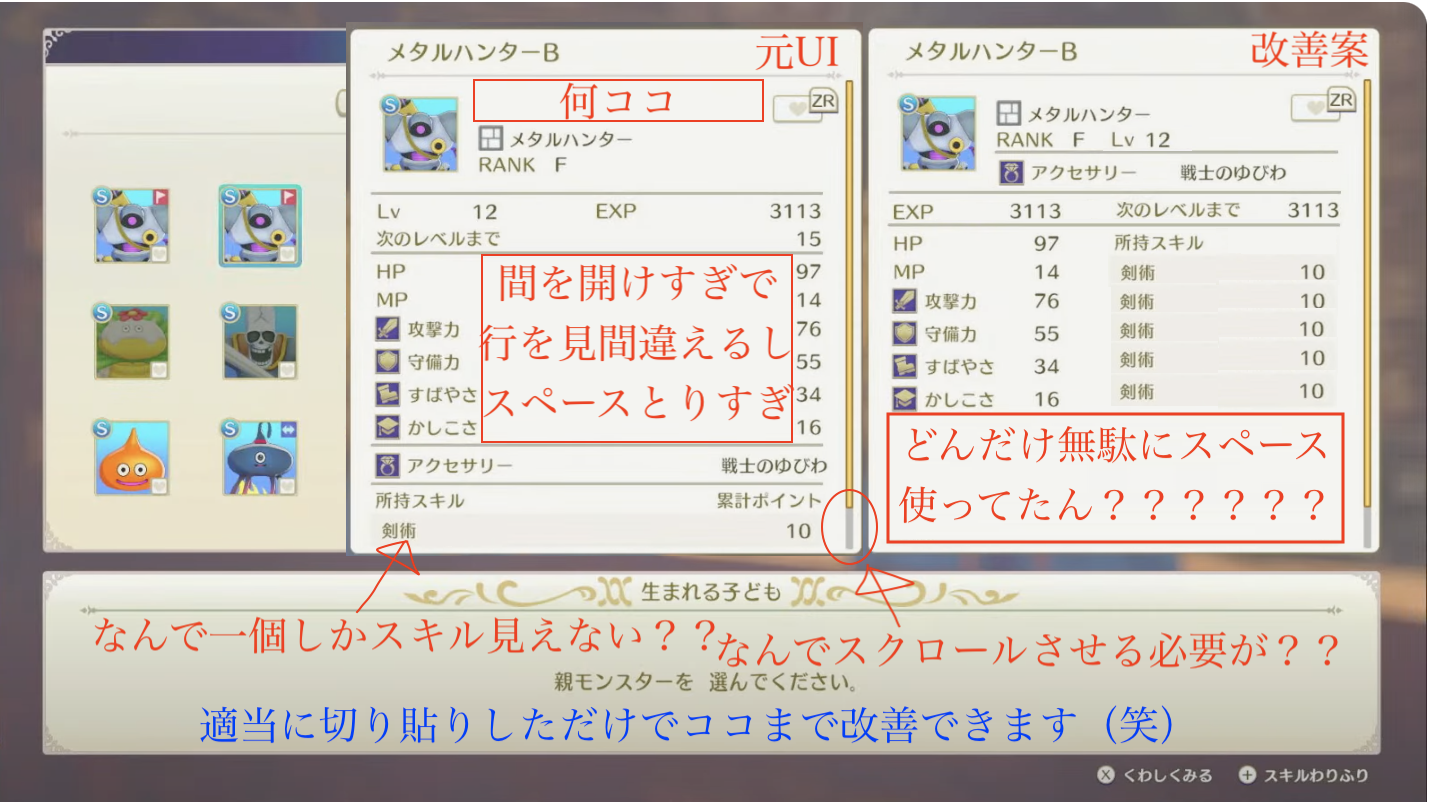【悲報】ドラクエモンスターズ3、あまりにもUIがクソすぎる… Twitter Facebook はてブ LINE コピー 2023.12.03 スポンサーリンク 1: それでも動く名無し 2023/12/02(土) 10:31:17.05 ID:/PZ5iqHvC こんなにスペースが余ってるのにスキルを一つしか表示しない模様 2: それでも動く名無し 2023/12/02(土) 10:31:41.82 ID:n8EdSFcF0 ? 8: それでも動く名無し 2023/12/02(土) 10:33:42.78 ID:/PZ5iqHvC >>2 こういうことや 続きを読む