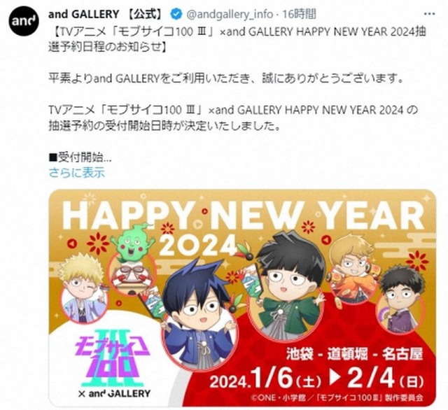 この声を受け、「and GALLERY」は「『TVアニメ「モブサイコ 100 II]Xand GALLERY HAPPY NEW YEAR2024』のビジュアルデザインについて」と題するお知らせを更新。「平素よりand GALLERYをご利用頂き、誠にありがとうございます。この度、2024年1月6日より開催予定の『TVアニメ「モブサイ100IIIJXandGALLERY HAPPY NEWYEAR2024』のビジュアル内のデザインについて、一部のSNSメディアでご指摘やご意見を頂いておりますが、弊店としては、お正月をモチーフにしたデザインとして作成したもので、それ以外の意図や意味はございません」と説明した。「お正月の企画として、ファンの皆様に楽しんで頂けるよう、運営していく所存ですので、引き続き開催をお待ち頂ければと思います。今後とも and GALLERYを宜しくお願いいたします」と呼びかけた。