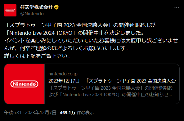 【悲報】任天堂、脅迫行為を受けてゲームのイベントを中止、スプラ甲子園決勝が延期、Nintendo Live 中止に、最強の任天堂法務部が話題に Twitter Facebook はてブ LINE コピー 2023.12.07 スポンサーリンク 1: それでも動く名無し 2023/12/07(木) 18:38:44.22 ID:a9G8+eP60 「スプラトゥーン甲子園2023 全国決勝大会」につきまして、 本日下記の事由によって開催を延期することを決定いたしましたので、お知らせいたします。 https://www.nintendo.co.jp/event/information/20231207/index.html 日本一治安の悪い街って何処? 続きを読む