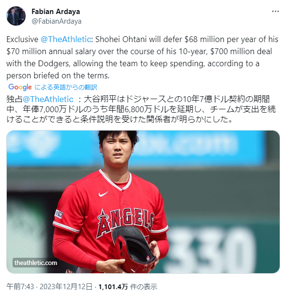 大谷は10年総額7億ドル(約1015億円)でドジャースと契約した。一部は後払いで、その額やいつから支払いが始まるか未定。米スポーツ専門局ESPNのジェフ・パッサン記者は会計ルールなどの観点から、年平均4000万-5000万ドル(約58億-72億円)ではないかと推測した。大谷とド軍双方に利点がある。