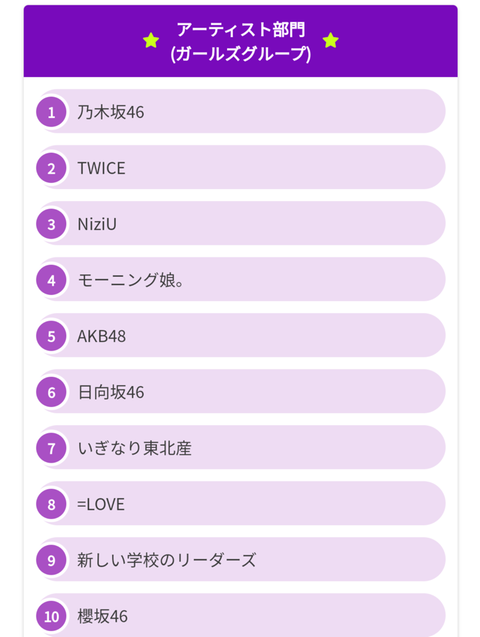 最新女性アイドルランキング!!意外な結果に?! (※画像あり) Twitter Facebook はてブ LINE コピー 2023.12.12 スポンサーリンク 1:それでも動く名無し:2023/12/12(火) 10:58:44.99 ID:6ZRHRsn/0 2:それでも動く名無し:2023/12/12(火) 11:01:51.38 ID:6ZRHRsn/0 1位 乃木坂46 2位 TWICE 3位 NiziU 4位 モーニング娘。 5位 AKB48 6位 日向坂46 7位 いぎなり東北産 8位 =LOVE 9位 新しい学校のリーダーズ 10位 櫻坂46 3:それでも動く名無し:2023/12/12(火) 11:01:59.96 ID:0uoVUwrI0 いぎなり東北産て 続きを読む