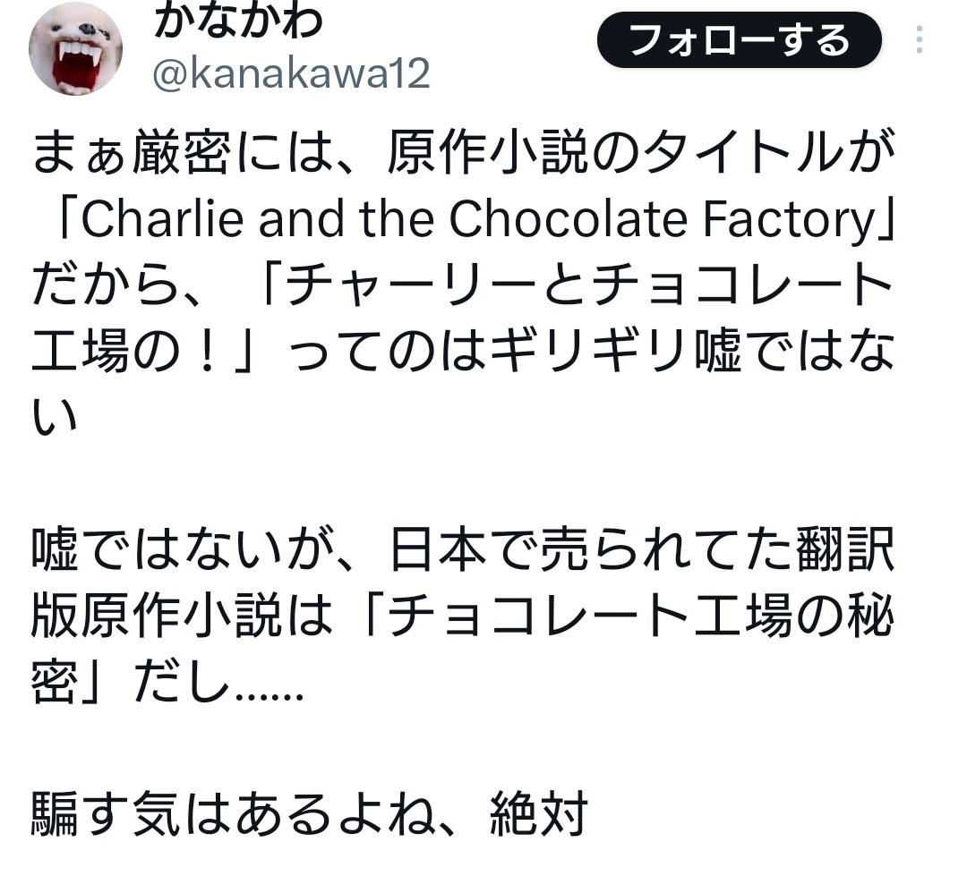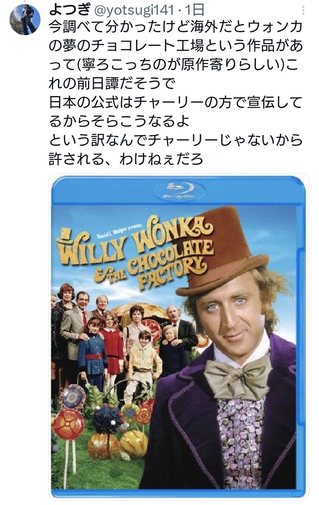 【悲報】チャーリーとチョコレート工場の前日譚とされる映画、実はタイトル詐欺だったことが判明する Twitter Facebook はてブ LINE コピー 2023.12.12 スポンサーリンク 1: それでも動く名無し 2023/12/12(火) 15:50:16.87 ID:s9jeXzJfr1212 ふざけんなよ 2: それでも動く名無し 2023/12/12(火) 15:50:28.27 ID:s9jeXzJfr1212 実際にはチャーリーとチョコレート工場(のスピンオフ)の前日譚だったらしい 3: それでも動く名無し 2023/12/12(火) 15:51:09.19 ID:s9jeXzJfr1212 予告でジョニー・デップの映像まで使ってるこれはアカンやろ 続きを読む