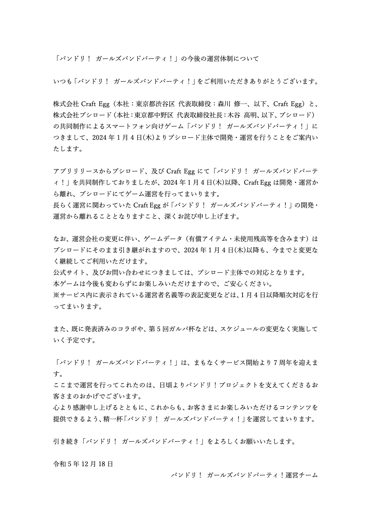 「バンドリ! ガールズバンドパーティ!」,Craft Eggが2024年1月4日をもって開発・運営から離脱。以降はブシロード主体の運営にhttps://t.co/WrA0gtLiDQ#バンドリ #ガルパ