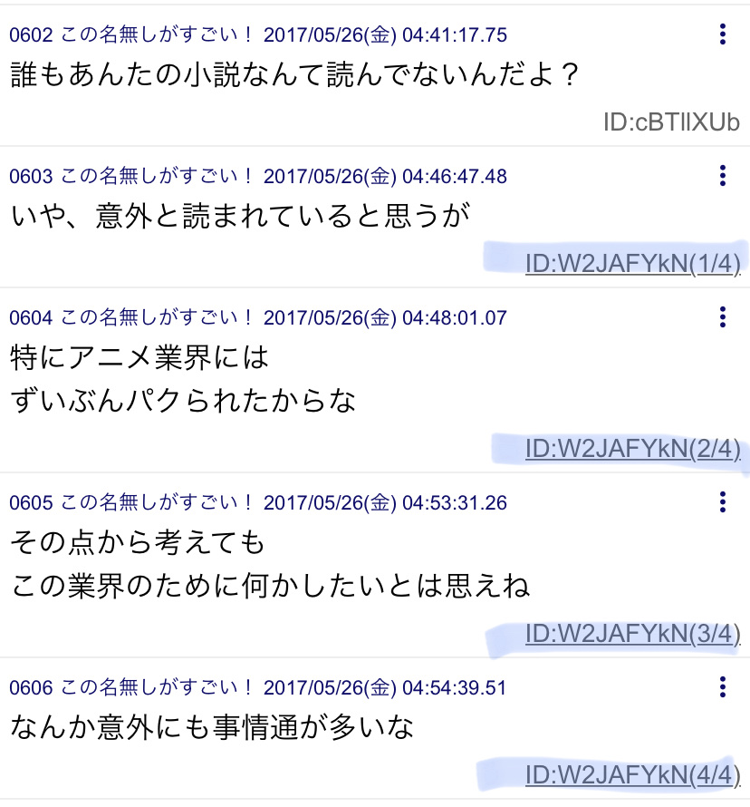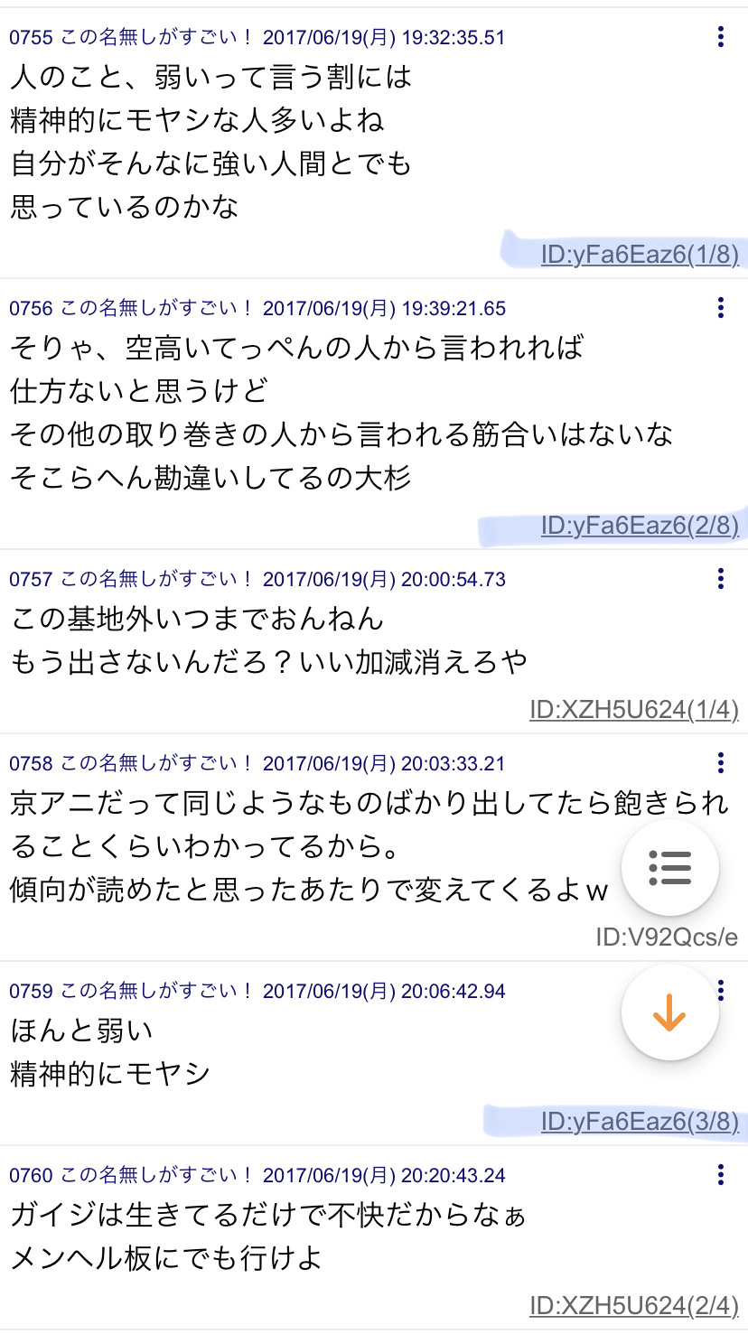 【画像】青葉真司の京アニ大賞スレへの書き込み、見つかる Twitter Facebook はてブ LINE コピー 2023.12.19 スポンサーリンク 1: それでも動く名無し 2023/12/19(火) 10:29:27.40 ID:a7+C7CjL0 理解不能 6: それでも動く名無し 2023/12/19(火) 10:32:07.20 ID:9Tsdt8ez0 改行と読点多くて思考が細切れなんやろな 19: それでも動く名無し 2023/12/19(火) 10:36:13.43 ID:fVltYSAv0 言いたいことまとめないで感情まかせに連投してる奴はやっぱりアレなんだと思う 続きを読む