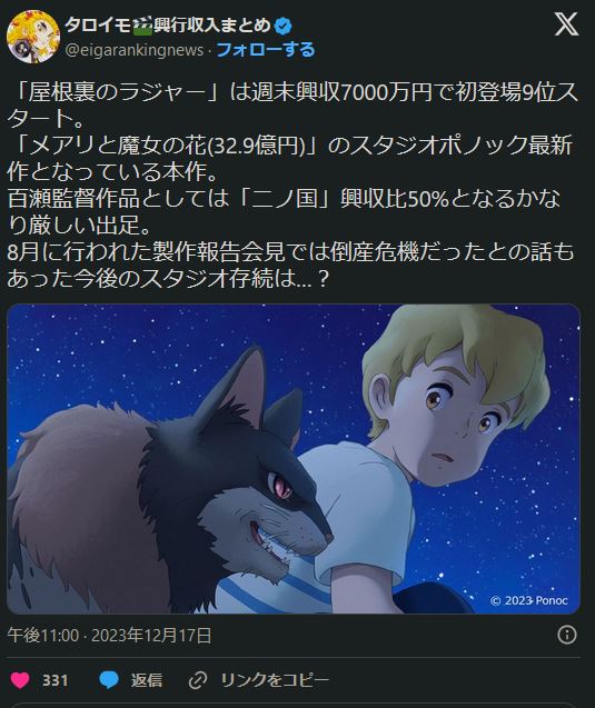 元ジブリスタッフ独立スタジオ制作『屋根裏のラジャー』が大爆死!大赤字確定 Twitter Facebook はてブ LINE コピー 2023.12.20 スポンサーリンク 1:2023/12/20(水) 10:38:15.34 ● BE:801948679-2BP(2000).net画像屋根裏のラジャーhttps://www.youtube.com/watch?v=b9mdsF3QJMk【週末アニメ映画ランキング】「鬼太郎誕生」100万人突破迫る、「屋根裏のラジャー」は9位スタートhttps://anime.eiga.com/news/column/eiga_ranking/120233/転載元スレッド:https://hayabusa3.2ch.sc/test/read.cgi/news/1703036295/ 続きを読む