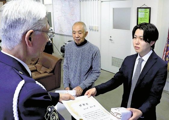 京都府警西京署(上村一則署長)は22日、通りすがりの“連携”で命を救ったとして、いずれも西京区に住む2人に感謝状を贈った。