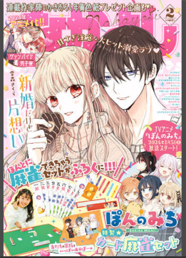 1月からテレビアニメがスタートする『ぽんのみち』のコミカライズ(原作:IIS-P、まんが:卯花つかさ、キャラクター原案:春場ねぎ)を受け、『なかよし』初となる麻雀セットがふろくに登場し、牌(パイ)はカードとなり持ち運び可能。