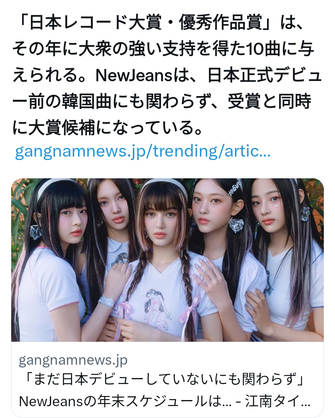 まだ日本デビューすらしてない「NewJeans」とかいう韓国の音楽グループ、何故か突然レコ大の大賞候補になる Twitter Facebook はてブ LINE コピー 2023.12.28 スポンサーリンク 1:2023/12/28(木) 18:30:36.495 ID:8QvlIywEM.netマジで初見で1ミリも聞いたことないのにどうして…転載元スレッド:https://viper.2ch.sc/test/read.cgi/news4vip/1703755836/ 続きを読む