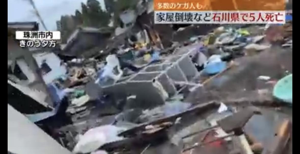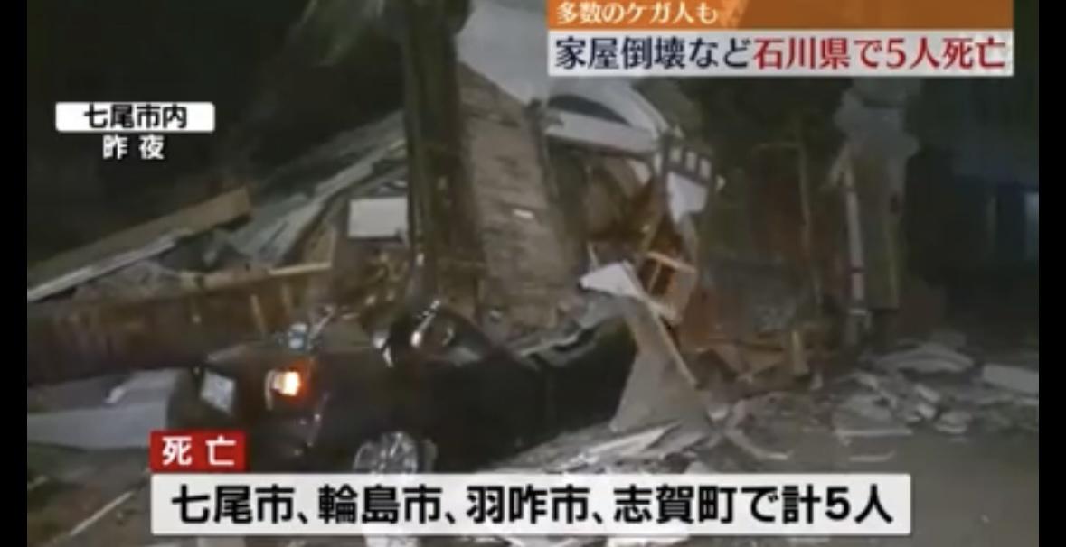 この地震により、家屋の倒壊などで七尾市、輪島市、羽咋市、志賀町であわせて5人の死亡が確認されています。県などによりますと、建物が崩れたり、火災などで多数のケガ人が出ているということです。