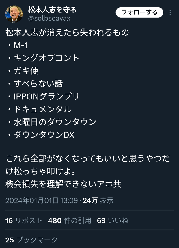 松本人志が消えたら失われるものがこちらwwwwwwwwwwwwwwwwwwwwwwwwwwwwwwwwwwwwwwwwwwwww Twitter Facebook はてブ LINE コピー 2024.01.02 スポンサーリンク 1:2024/01/01(月) 22:11:32.057 ID:g5ZE5gxm0.net2:2024/01/01(月) 22:12:05.121 ID:ztrGJcvYd.netわりとどうでもいい3:2024/01/01(月) 22:12:07.554 ID:AKV+th1P0.netテレビ見ないんで大丈夫です転載元スレッド:https://viper.2ch.sc/test/read.cgi/news4vip/1704114692/ 続きを読む
