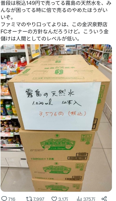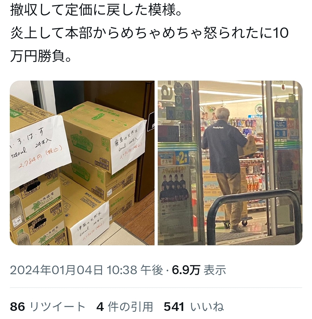 【悲報】被災地のファミマオーナー、勝手に水を3000円で販売し炎上 (※画像あり) Twitter Facebook はてブ LINE コピー 2024.01.05 スポンサーリンク 1:それでも動く名無し:2024/01/04(木) 23:12:07.61 ID:OeOOwQBW0 無料配布という発想がない模様 2:それでも動く名無し:2024/01/04(木) 23:13:05.48 ID:+0d+mwKB0 やっぱり老人かよ 7:それでも動く名無し:2024/01/04(木) 23:14:05.62 ID:jWcnJRHK0 これが資本主義やぞ 続きを読む